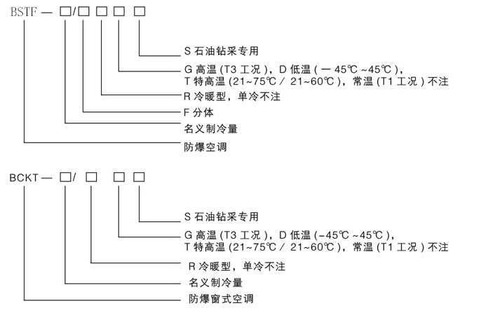 石油鉆井專用防爆空調(diào)型號編制說明: